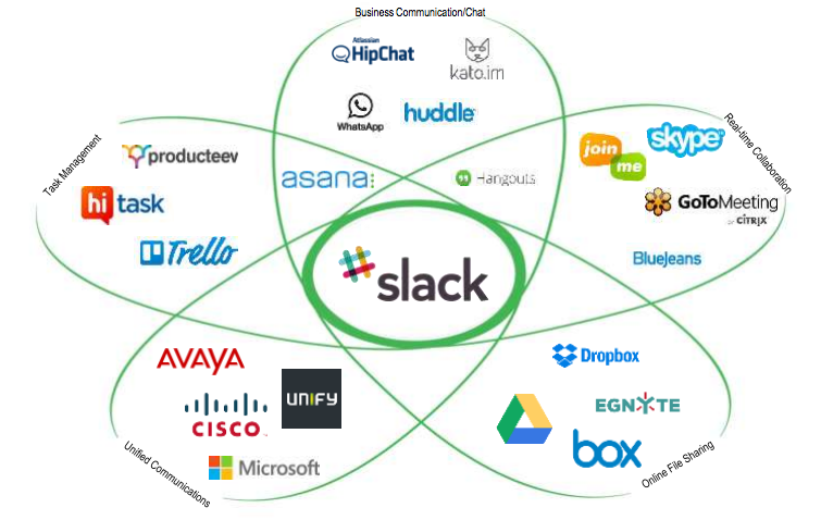 As you see to the left, the ever popular slack is at the center, touching on business communication/chat, collaboration, file sharing, unified communication and task management. It competes with them all but it actually does all the things the petals do in one tool!